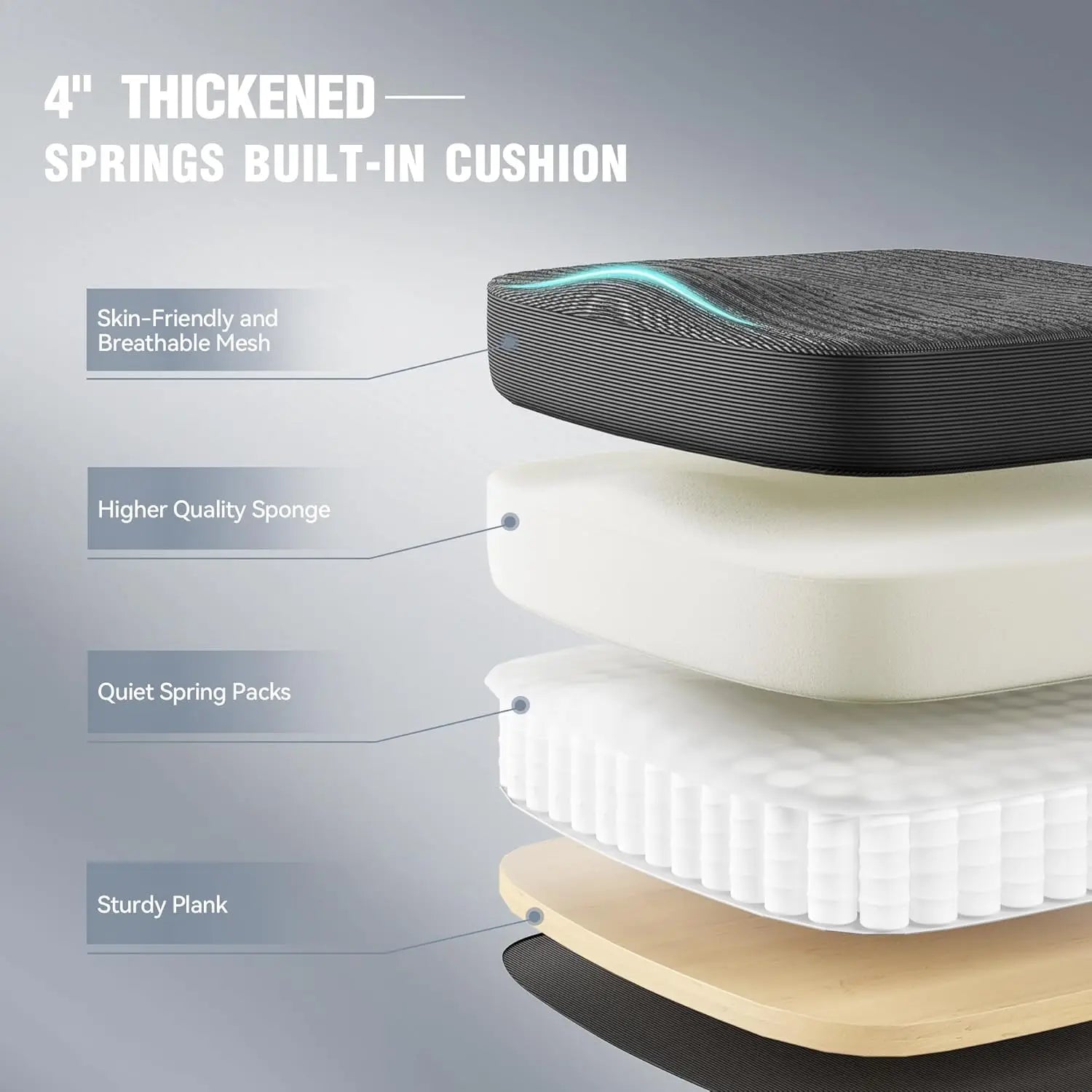 High-resilience mesh backrest, pocket spring seat cushion wrapped in breathable fabric, and a reinforced steel base with smooth caster wheels.